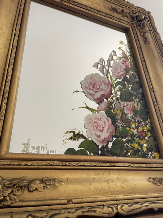 miroir en bois doré, avec sa peinture signée Bagni 2001