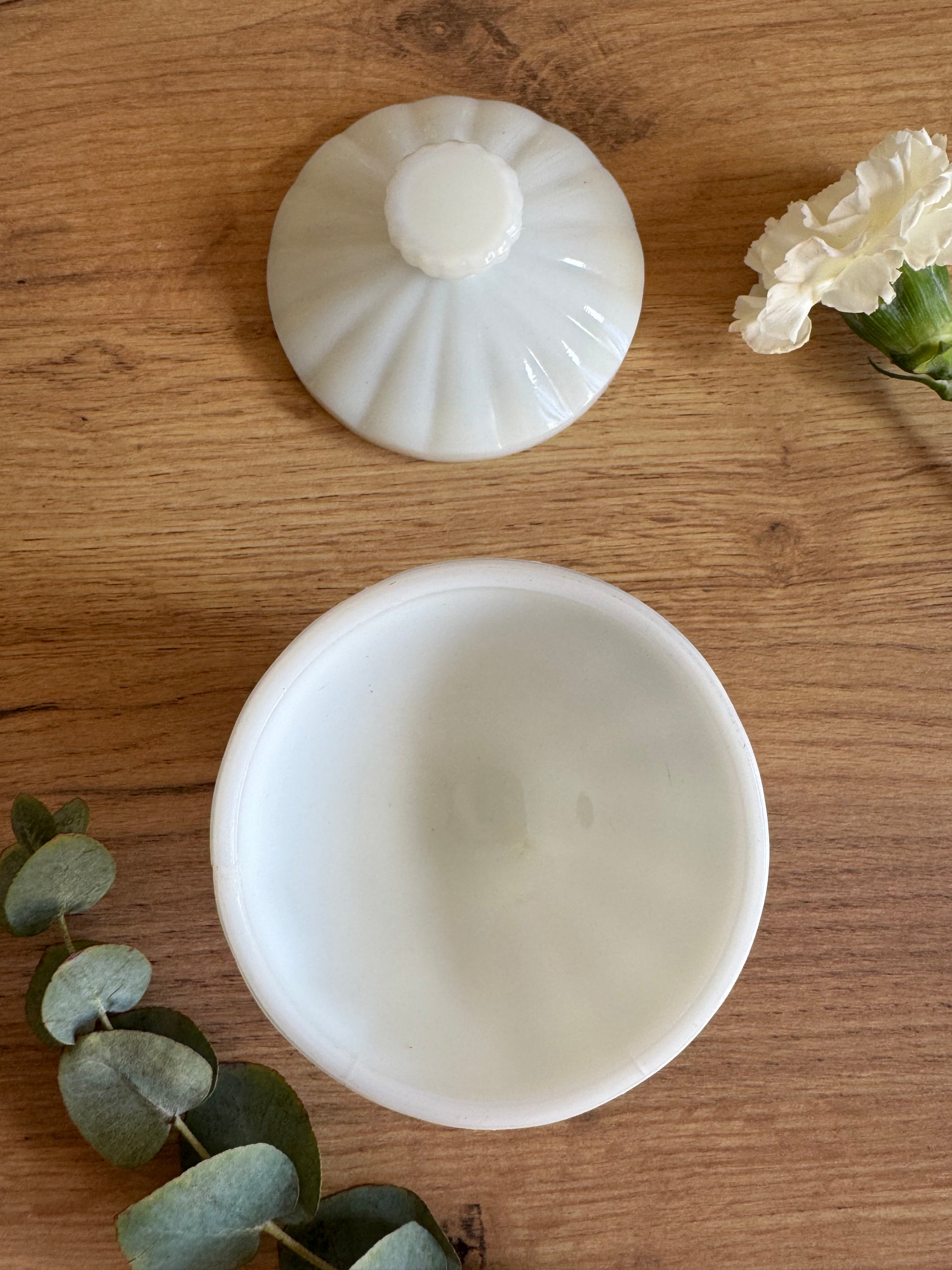 Charmante bonbonnière ancienne en opaline, posée sur un élégant pied. Sa forme délicate et sa belle opaline lumineuse en font un objet aussi décoratif qu’utile, parfait pour présenter des douceurs, bijoux ou petits trésors.